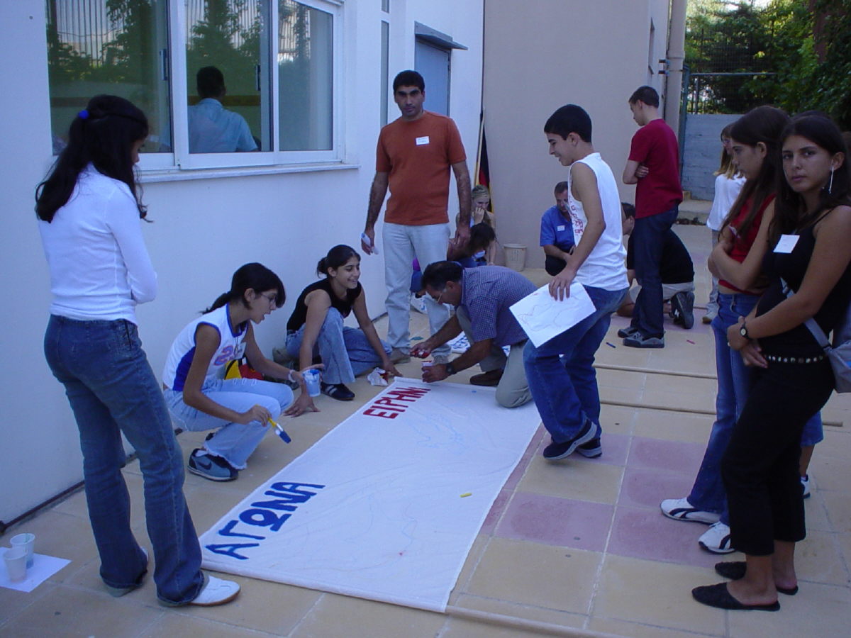 Οι εργασίες ουσιαστικά ξεκίνησαν τη Δευτέρα 15 Σεπτεμβρίου. Νωρίς το πρωί οι σχολικές ομάδες έφτασαν στο διδακτήριο του Λυκείου Γαζίου. Τους καλωσόρισε ο Διευθυντής κ. Γρηγόρης Τσαπαρίδης. Στη συνέχεια, οργανώθηκαν ομάδες εργασίας και ορίστηκαν οι ομάδες που θα λάβουν μέρος στις αθλητικές εκδηλώσεις. Τα μεγαλύτερα παιδιά ασχολήθηκαν με τη σύνταξη ενός προσχεδίου ψηφίσματος με θέμα την ολυμπιακή εκεχειρία, το οποίο θα εγκριθεί από την ολομέλεια και θα προβληθεί προς τους αρμοδίους φορείς και παράγοντες. Τα παιδιά κάθε χώρας ασχολήθηκαν με την κατασκευή ενός πανό, με μηνύματα και συνθήματα σχετικά με την ολυμπιακή εκεχειρία, ένα θεσμό που έκανε τους αρχαίους Ολυμπιακούς Αγώνες ξεχωριστούς και που αξίζει να προβάλλει ο Ελληνισμός ως κληρονομιά του αρχαίου ελληνικού πνεύματος. Τα πανό θα χρησιμοποιηθούν, το βράδυ της Τρίτης 18 Σεπτεμβρίου, κατά την πορεία ειρήνης - λαμπαδηφορία, όπως προβλέπεται στο πρόγραμμα, στους κεντρικούς δρόμους Γαζίου και στις πολιτιστικές εκδηλώσεις.